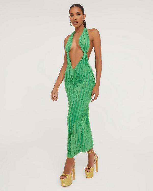 Extreme Plunge Halterneck Maxi Dress In Green Shirred EGO