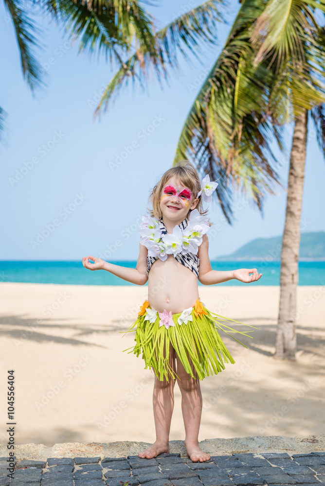 Fancy dress hawaiian girl clearance, Smiling little girl with face painting in Hawaiian costume. Fancy clearance