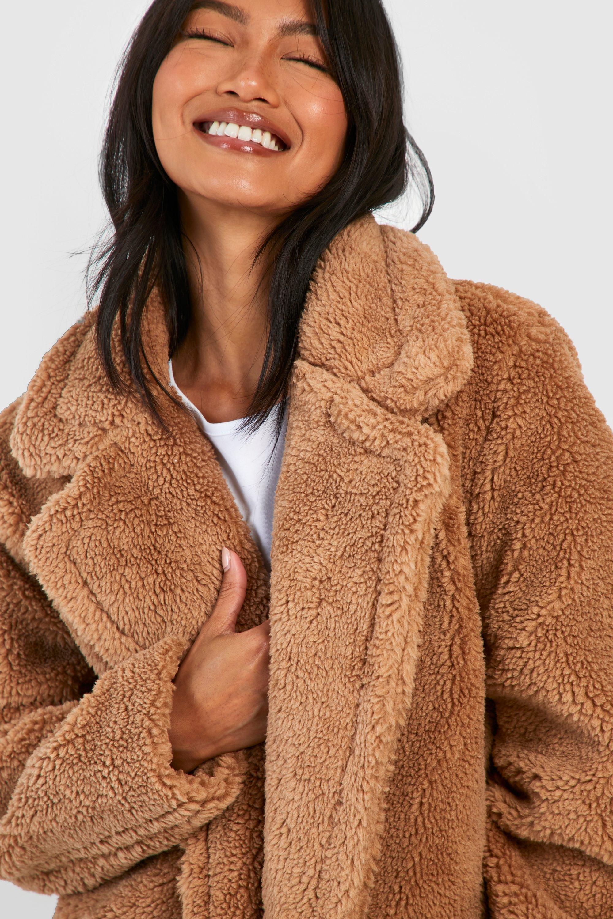 Faux fur coat xs clearance, Double Breasted Faux Teddy Fur Coat boohoo clearance