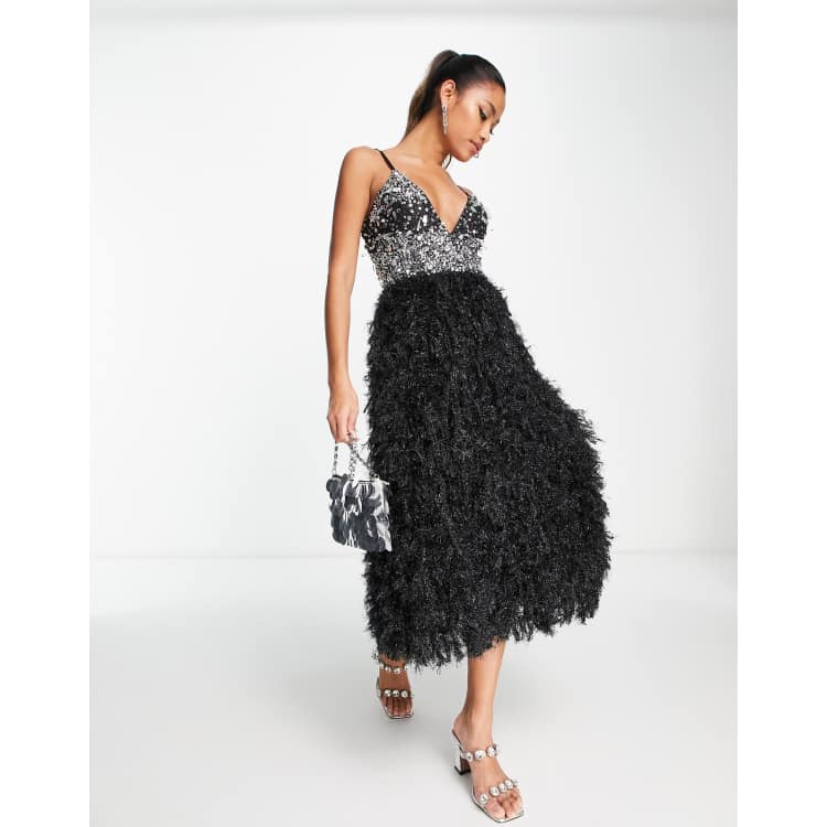 ASOS DESIGN embellished sequin plunge neck faux feather midi dress in black