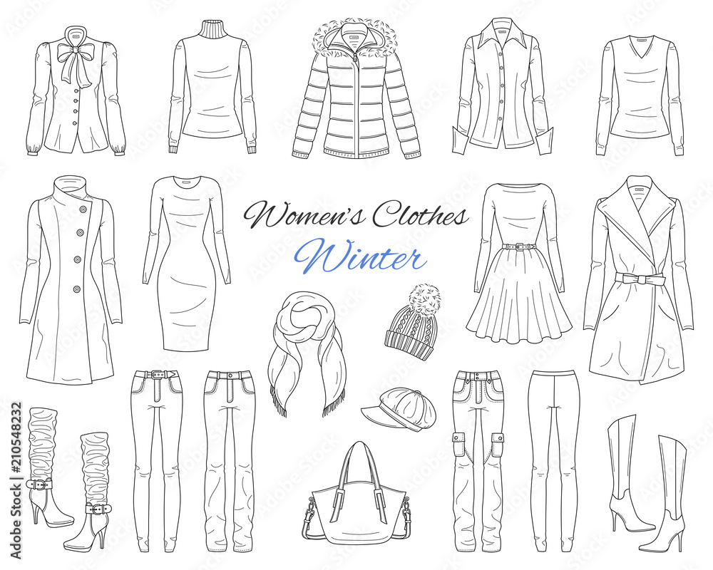 Women s clothes collection. Winter outfit. Vector sketch