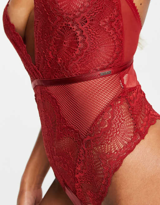 Ann Summers Obsession lace and fishnet plunge front bodysuit with strapping detail in red