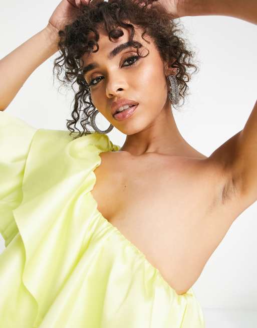ASOS LUXE satin ruffle off shoulder mini dress in lemon