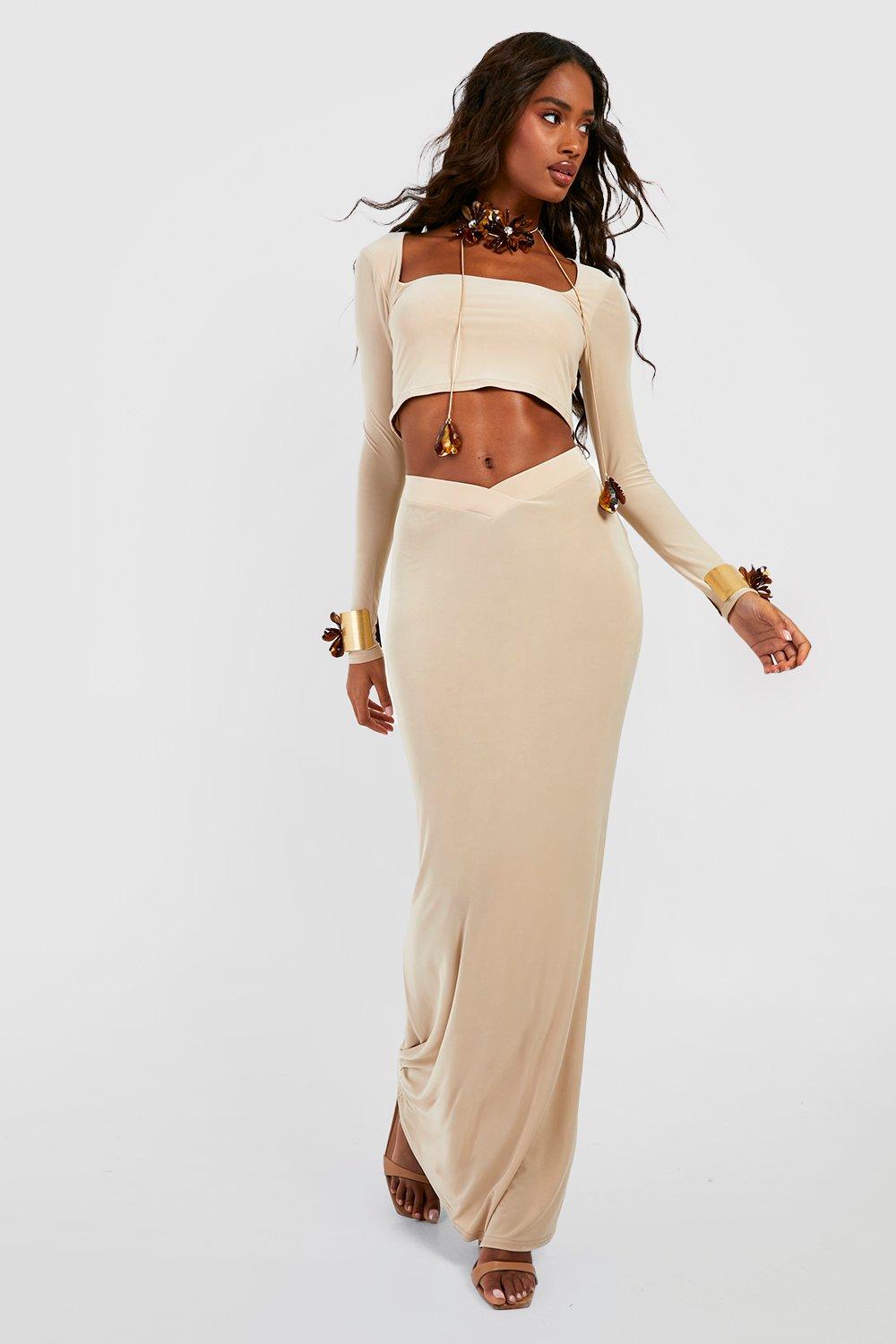 Long Sleeve Cropped Top V Waist Flared Hem Maxi Skirt