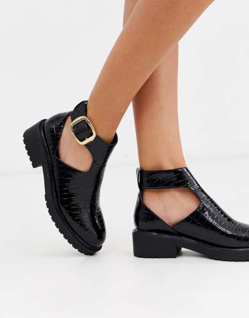 London Rebel cut out flat chunky ankle boots in black croc