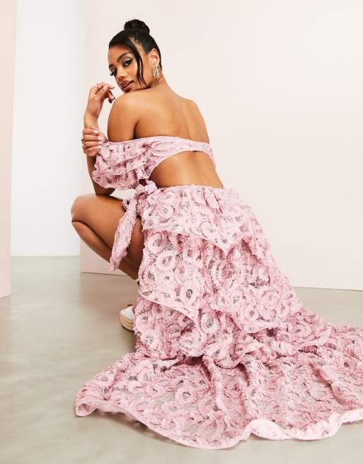 ASOS LUXE co ord beach 3D floral wrap tiered wired maxi skirt in pink