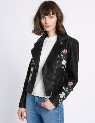 ASOS Premium Leather Biker Jacket With Floral Embroidery