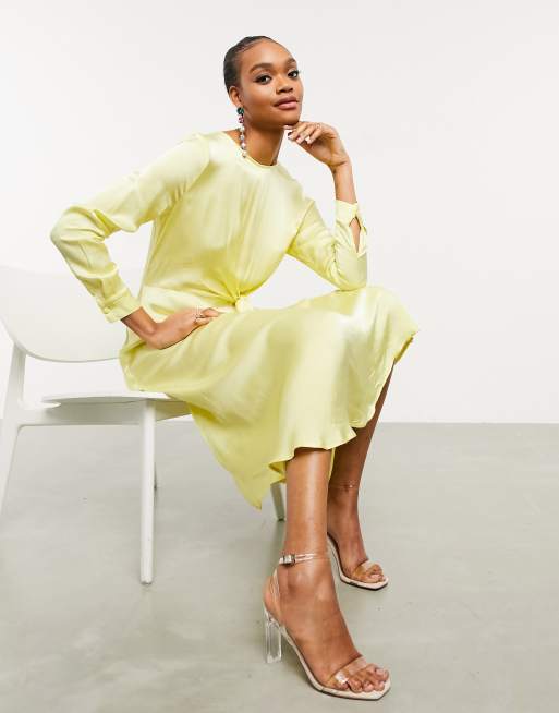 Mindy Lemon Satin Midi Dress with Long Sleeves Ghost London