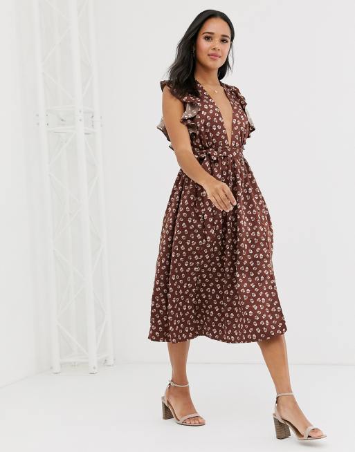 Glamorous plunge front midi dress with ruffle shoulders in smudge