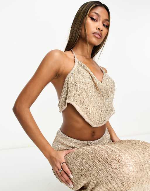 ASOS DESIGN knitted cowl neck crop top in gold sequin yarn co ord
