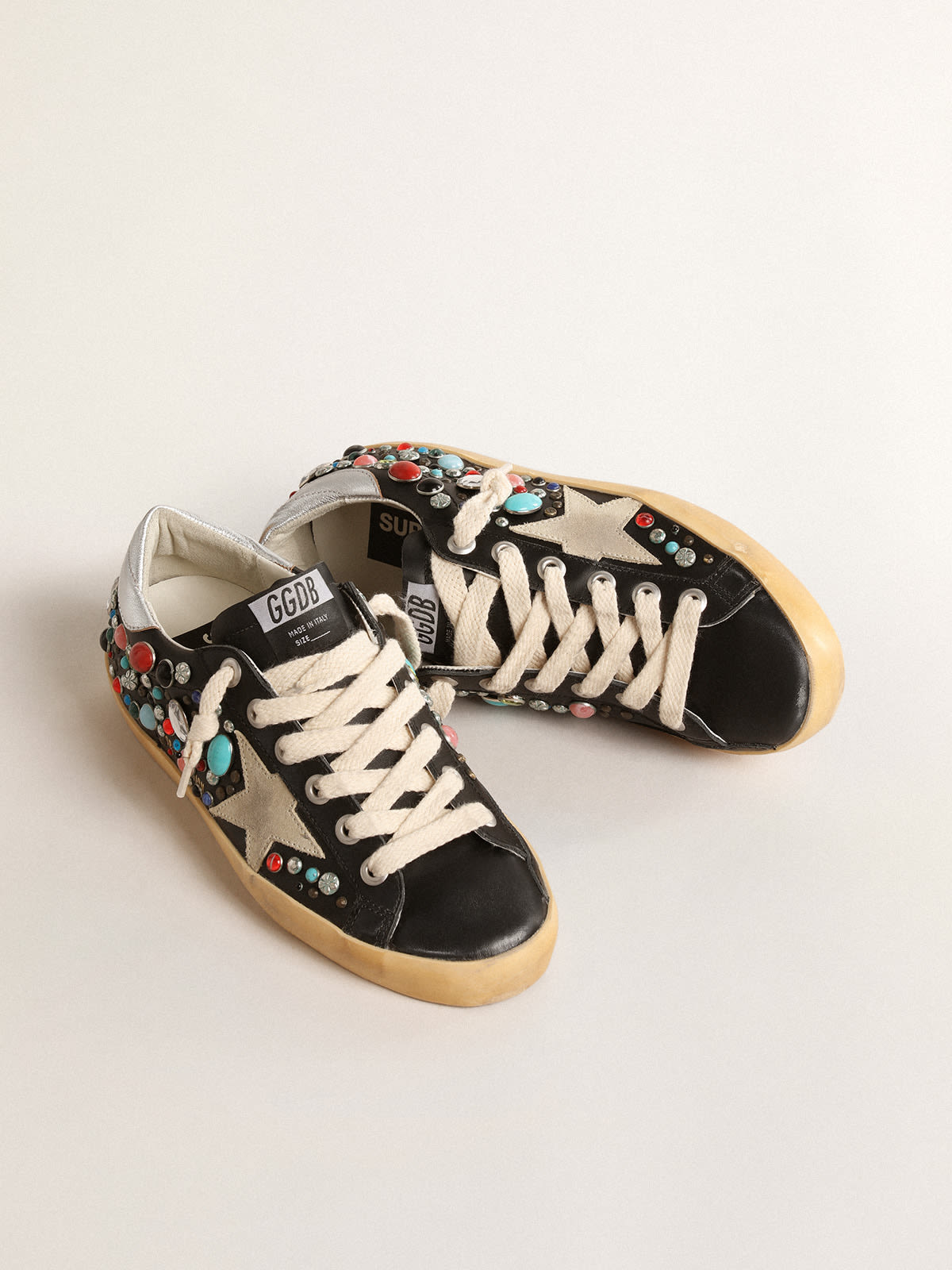Super Star sneakers in black leather with hammered studs and silver laminated leather star
