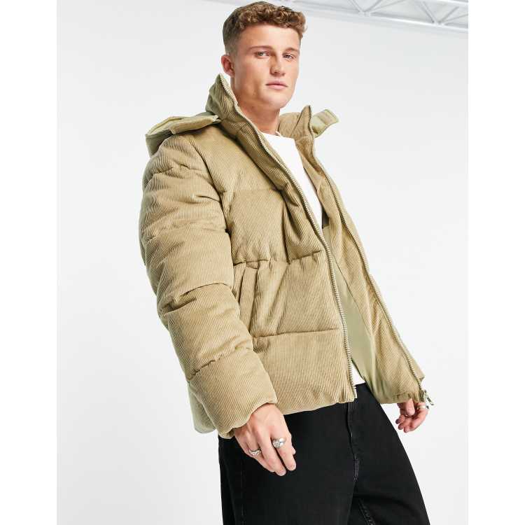 ASOS DESIGN cord puffer jacket with removable hood in tan ASOS