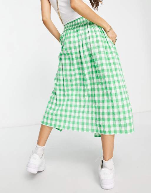 ASOS DESIGN Petite textured green white gingham full midi skirt with pockets