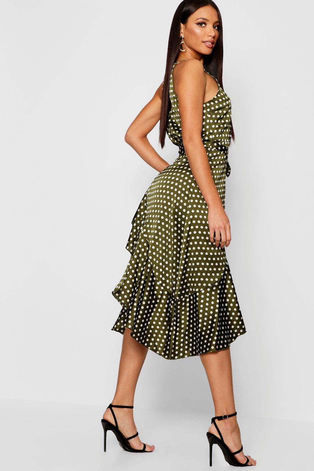 Satin Polka Dot Frill Detail Midi Dress