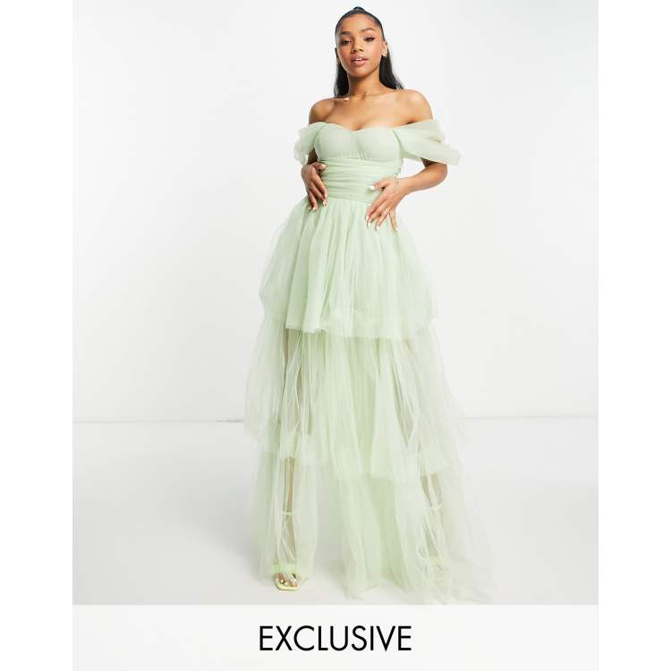 Lace Beads exclusive off shoulder tulle tiered maxi dress in sage green