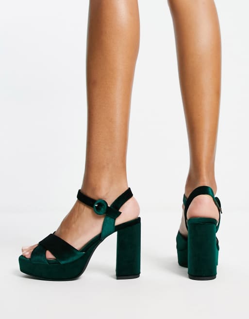 Dark Green Velvet Platform Block Heel Sandals New Look