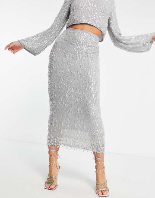 ASOS EDITION sequin crystal fringe midi skirt in grey