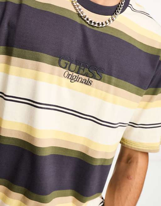 Guess t shirt striped yellow clearance, Guess Originals LOGO STRIPE Print T shirt sandy shore multi clearance
