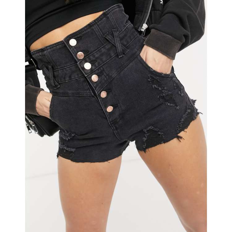 High waisted black button shorts clearance, Signature 8 high waisted exposed button denim short in wash black clearance
