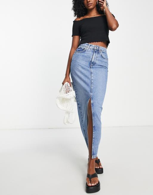 ASOS DESIGN denim 90s midi skirt in mid wash blue MBLUE ASOS