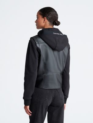 Hooded faux leather moto jacket clearance, Mixed Media Faux Leather Biker Jacket Calvin Klein Canada clearance
