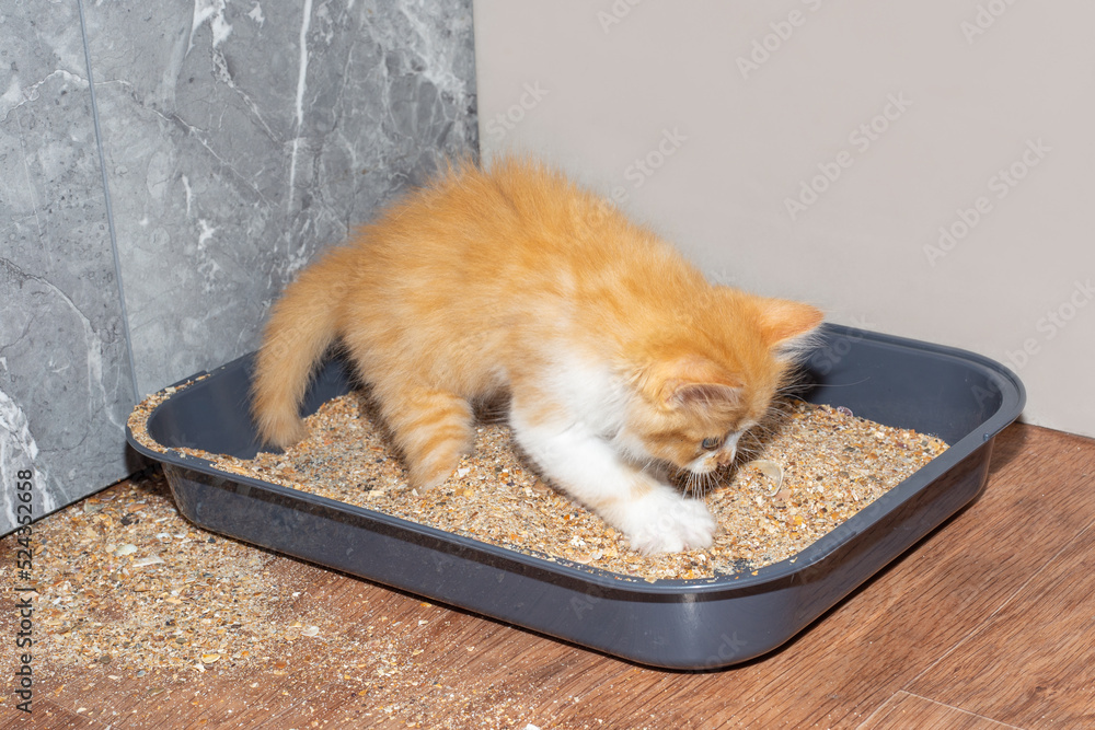 red kitten rakes sand in the cat litter box. Potty training a