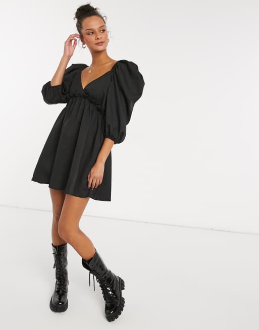 In The Style x Lorna Luxe mini smock dress with exaggerated sleeves in black