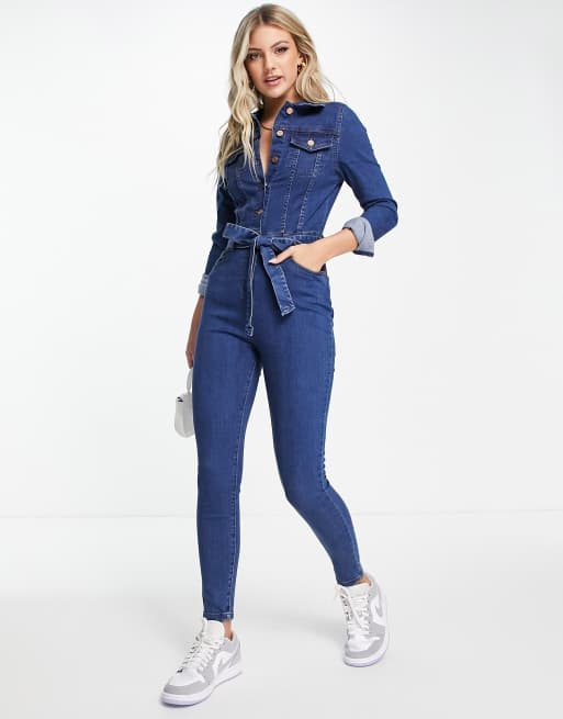 Parisian long sleeve tie waist denim jumpsuit in mid wash blue ASOS