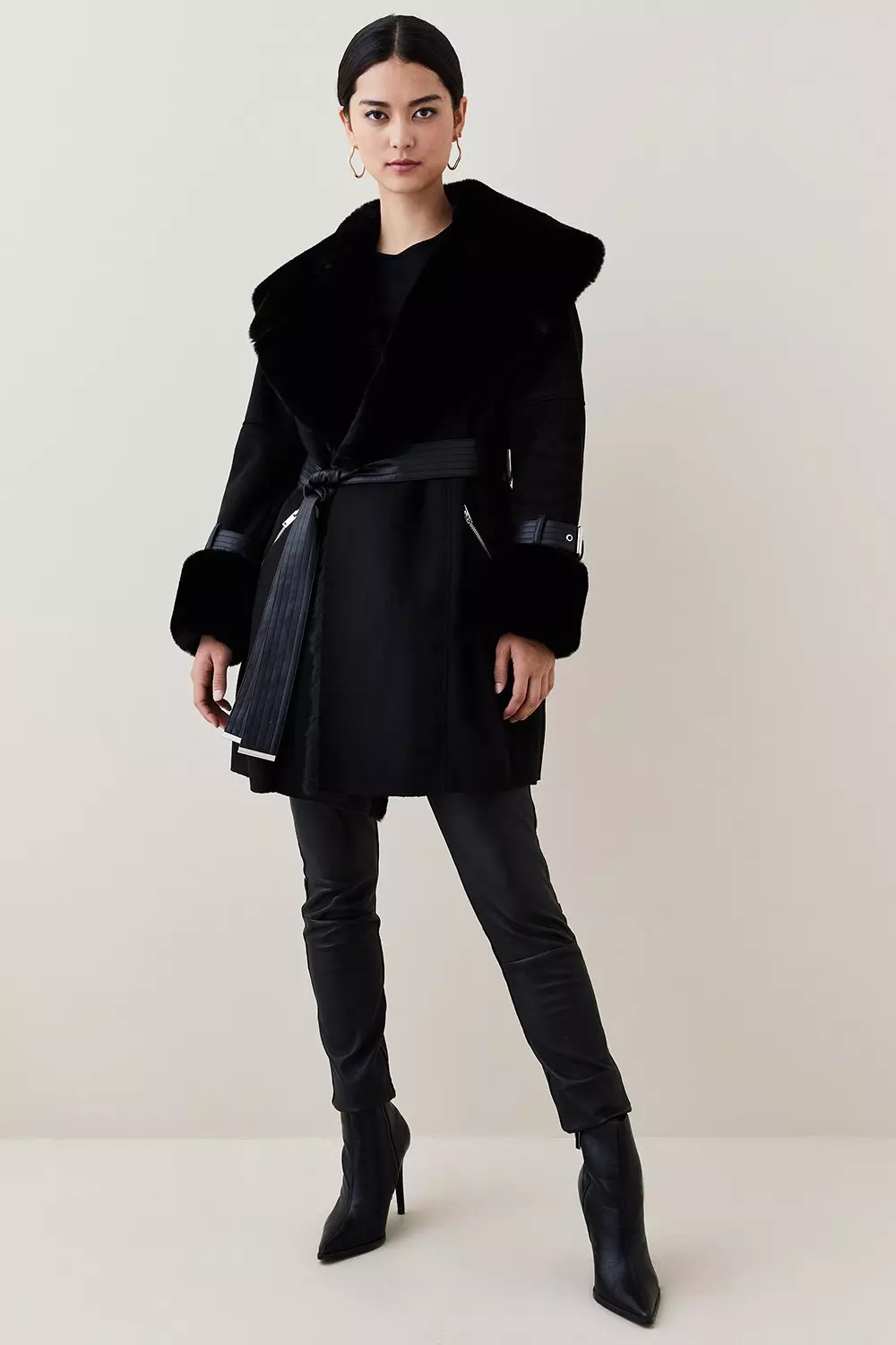Italian Wool Sheepskin Panelled Belted Coat Karen Millen