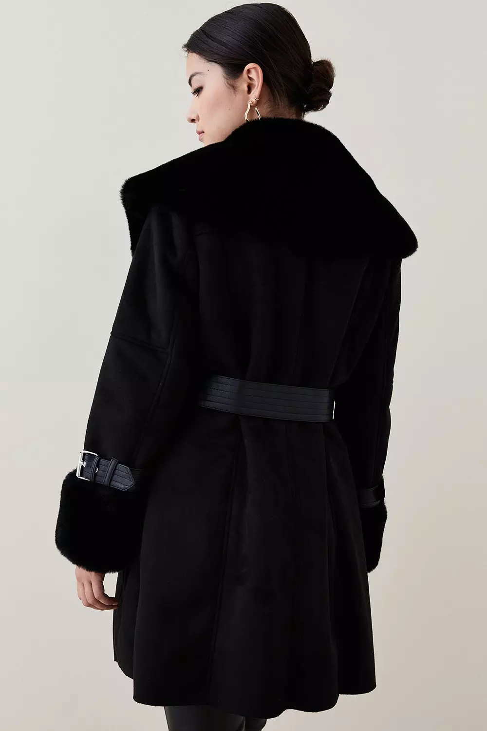 Karen millen sheepskin belted coat clearance, Petite Mock Shearling Fur Cuff Belted Coat Karen Millen clearance