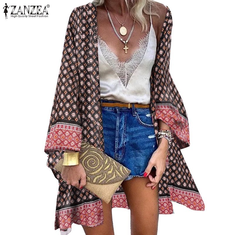 Kimono cardigan shopee clearance, ZANZEA Work Kimono Bohemian Holiday Women Summer Printed Cover Up Long Sleeve Fashion Cardigan clearance