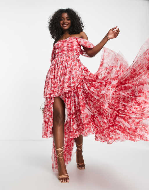 Lace Beads Robe longue fleurs avec ourlet asym trique et