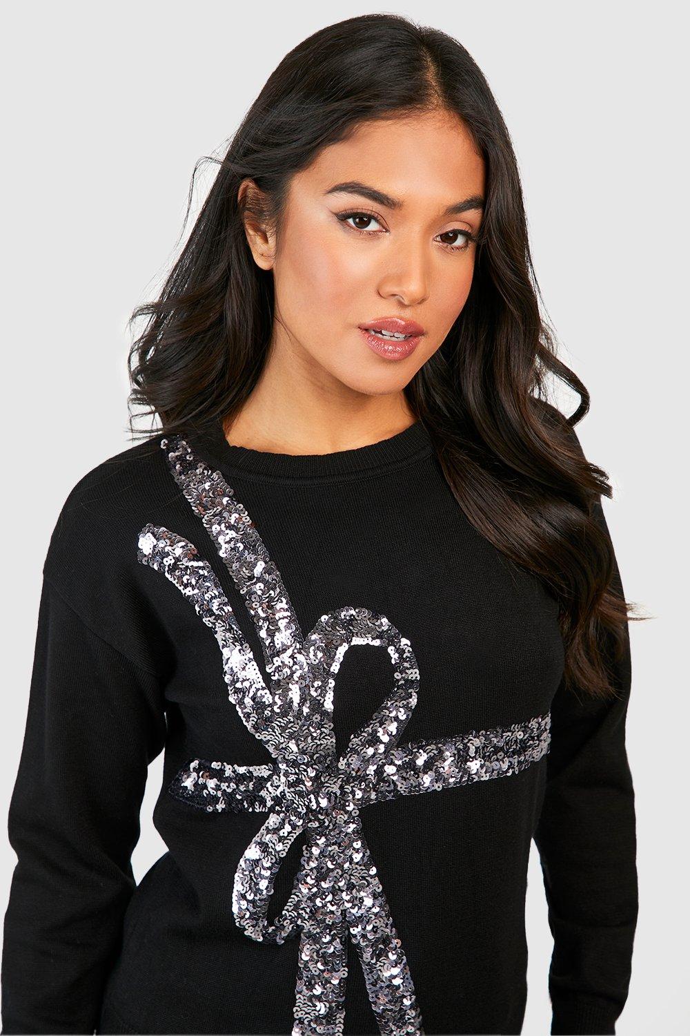 Women s Petite Sequin Bow Christmas Jumper Boohoo UK