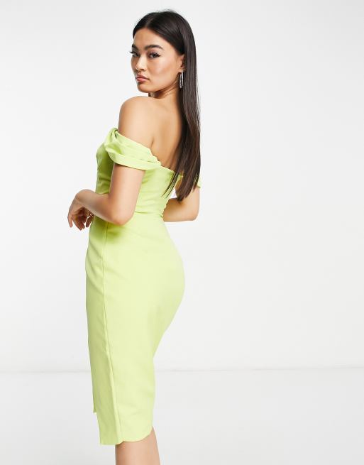 Lavish Alice pleat detail bardot midi dress in lime green