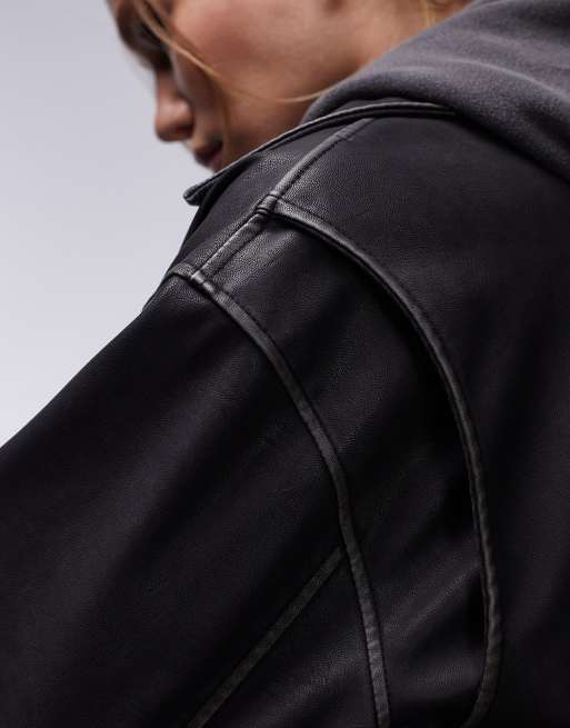 Leather zip up hoodie clearance, Topshop faux leather jacket with center front zip in washed black clearance