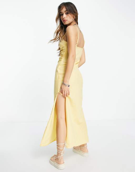 ASOS DESIGN linen strappy ruched side split leg midi sundress in lemon