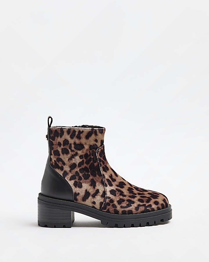 Girls Brown Leopard Velvet Heeled Boots