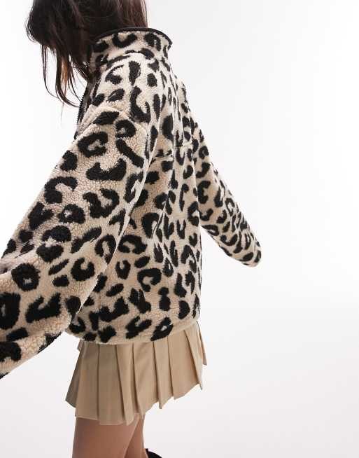 Topshop borg zip through fleece jacket in leopard print