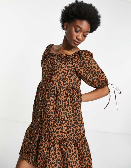 Influence tie puff sleeve button through dress in leopard print