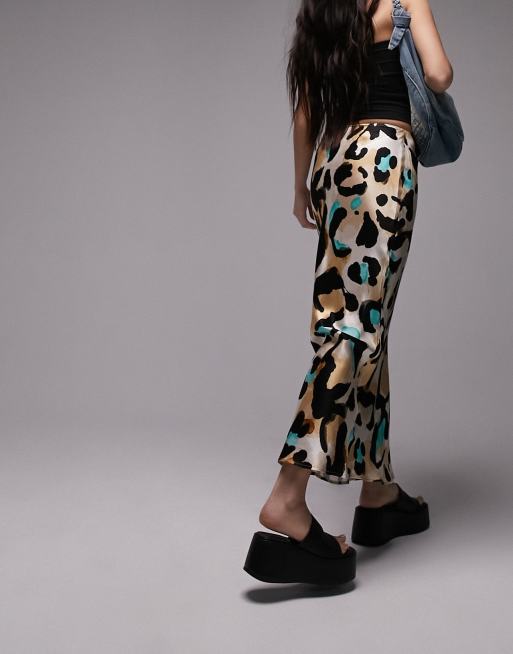Topshop leopard print satin bias midi skirt in multi