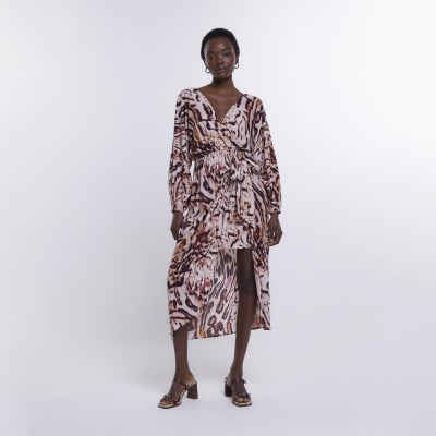 Leopard print wrap midi dress clearance, Brown animal print asymmetric wrap midi dress River Island clearance