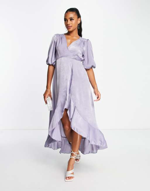 Flounce London satin puff sleeve maxi wrap dress in light blue satin