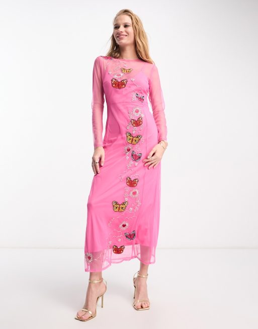 Never Fully Dressed long sleeve embellished maxi dress in pink butterfly print