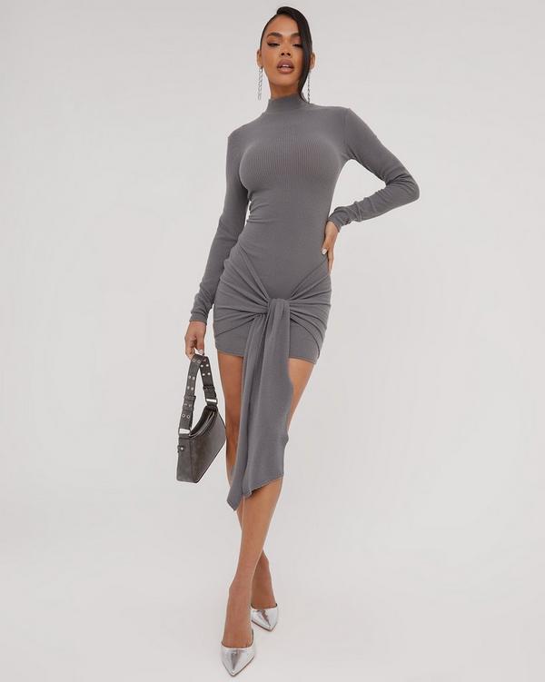 Long sleeve bodycon dress clearance, High Neck Long Sleeve Knot Drape Detail Mini Bodycon Dress In Grey clearance