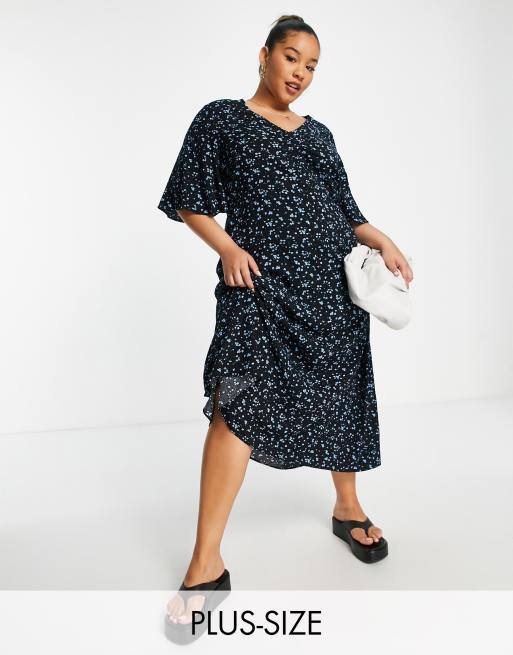 Mango Curve ruched front midi dress in black floral ASOS