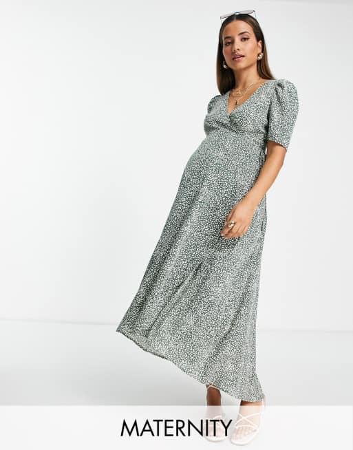 Missguided Maternity printed wrap midi dress with dipped hem in green