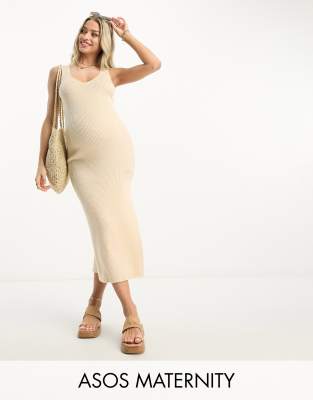 Maternity slip dress white clearance, ASOS DESIGN Maternity knitted v neck midi dress in stone clearance