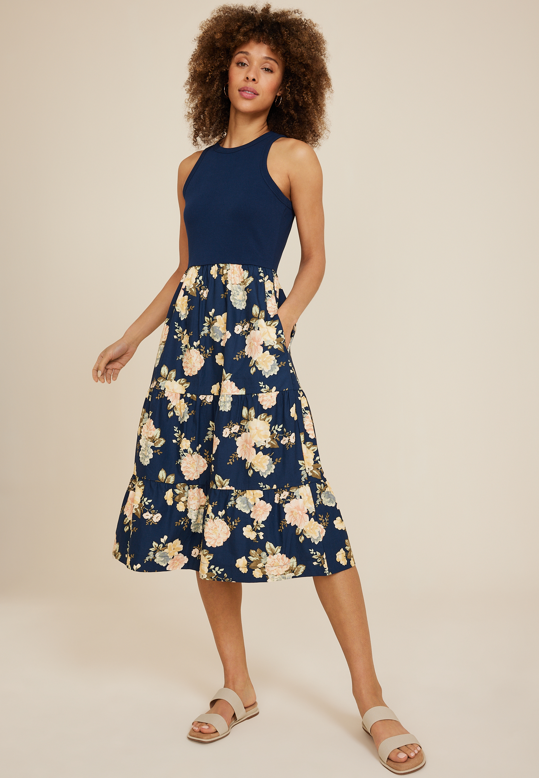 Maurices Women s L Blue Floral Sleeveless Ruffle Midi Dress Boho Cottage Casual