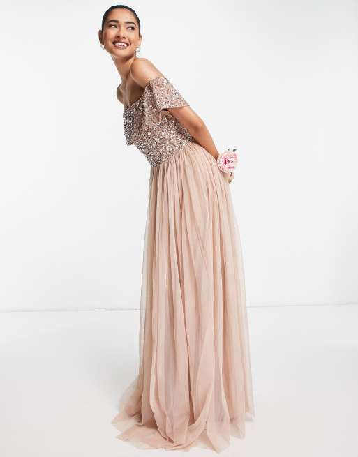 Maya bridesmaid bardot maxi tulle dress with tonal delicate sequins in taupe blush clearance, Maya Bridesmaid Bardot Maxi Tulle Dress With Tonal Delicate clearance