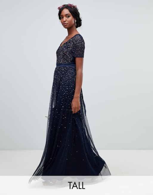 Maya Tall v neck maxi tulle dress with contrast tonal delicate sequins in navy
